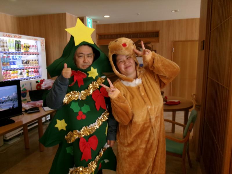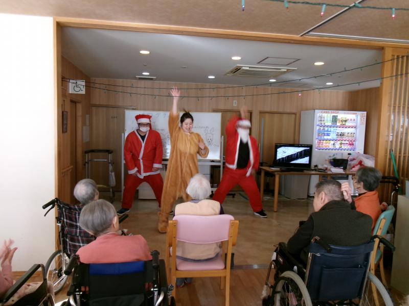 サンタクロースとトナカイに扮した職員が歌とダンスを披露。